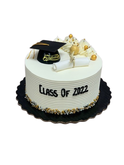 Check out our two layer graduation cake complete with an edible scroll and cap with an accent of sprinkles around the bottom.